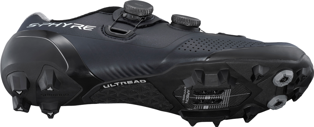 Shimano's exclusive ULTREAD XC rubber outsole features a technical tread that offers maximum grip in racing situations. For extreme conditions, the metal claw-shaped lugs allow you to choose between ultralight performance or maximum traction on muddy terrain.